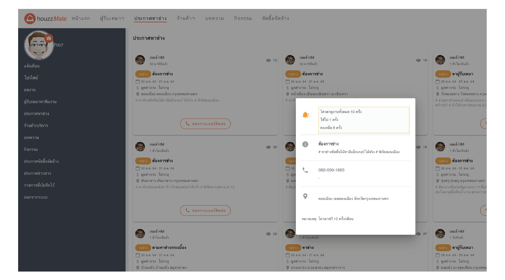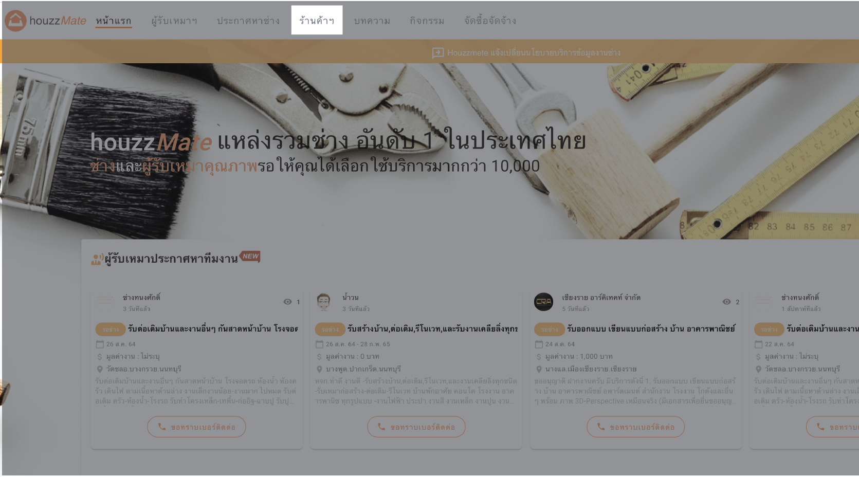 สำหรับท่านที่เป็นช่าง ต้องการที่จะดูรายละเอียดงานและเบอร์โทรสำหรับการติดต่อจากประกาศความต้องการ หาช่าง ในเว็บไซต์ของ HouzzMate อย่างแรกที่ต้องทำหลังจากสมัครเป็นสมาชิกแล้วก็คือ การเปิดให้บริการเสียก่อน ไม่เช่นนั้นจะยังไม่มีสิทธิ์ในการเข้าดูเบอร์ติดต่อเพื่อเสนอบริการให้กับผู้ที่มาทำการ ประกาศหาช่าง เอาไว้ เหตุผลที่ไม่อนุญาตให้สมาชิกทั่วไปสามารถเข้าถึงเบอร์โทรติดต่อของผู้ที่มา หาช่าง โดยเกิดจากความห่วงใยในเรื่องความเป็นส่วนตัวของท่านสมาชิก ที่อาจจะมีผู้ที่ไม่ได้เป็นช่างสามารถเข้ามาดูเบอร์ติดต่อและโทรไปรบกวนได้ ดังนั้นเราจึงเพิ่มนโยบายในเรื่องนี้ขึ้น เพื่อให้ผู้ที่มาแจ้งความ ต้องการหาช่าง มั่นใจได้ว่าผู้ที่ติดต่อไปทุกคนเป็นช่างที่พร้อมในการให้บริการมากยิ่งขึ้นกว่าเดิม