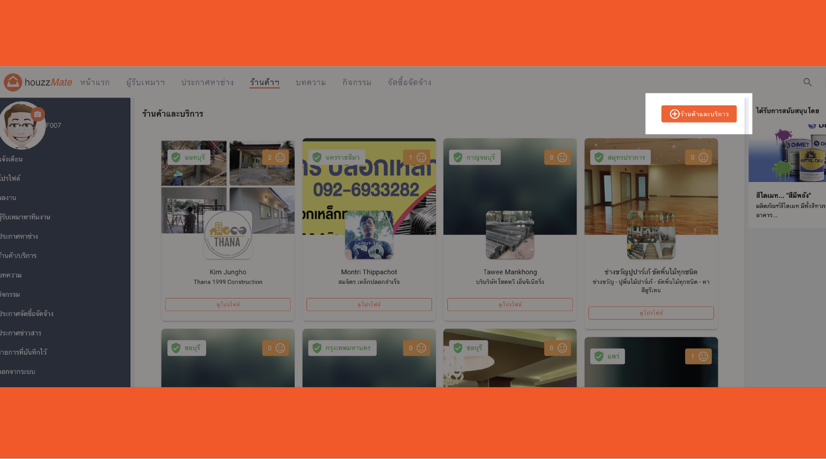 5.) หลังจากกรอกข้อมูลและยอมรับเงื่อนไขการเปิดร้านค้าแล้ว เพียงเท่านี้การเปิดร้านค้า/บริการได้เสร็จสิ้น ท่านสามารถที่จะดูเบอร์โทรศัพท์ติดต่อช่างท่านอื่นๆ ลงข้อมูลรายละเอียดเกี่ยวกับการให้บริการของท่านที่เป็นช่างหรือร้านค้า และสามารถประกาศขายสินค้าภายในเว็บไซต์ HouzzMate.com ได้แล้ว