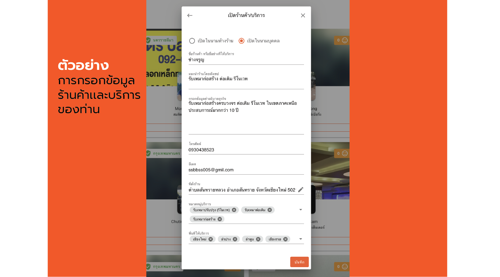 4.) กรอกข้อมูลเกี่ยวร้านค้าของท่านให้ครบถ้วน จากนั้นเมื่อกรอกข้อมูลเสร็จสิ้นให้ทำการ คลิกที่ปุ่ม ตกลง เปิดร้านค้าบริการ