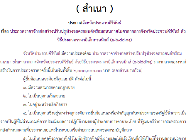 ประกาศจังหวัดประจวบคีรีขันธ์ เรื่อง ประกวดราคาจ้างก่อสร้างปรับปรุงโรงจอดรถยนต์พร้อมถนนภายในศาลากลางจังหวัดประจวบคีรีขันธ์ ด้วยวิธีประกวดราคาอิเล็กทรอนิกส์ (e-bidding)