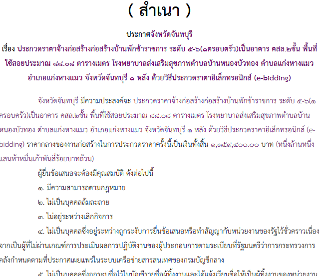 ประกาศจังหวัดจันทบุรี เรื่อง ประกวดราคาจ้างก่อสร้างก่อสร้างบ้านพักข้าราชการ ระดับ ๕-๖(๑ครอบครัว)เป็นอาคาร คสล.๒ชั้น พื้นที่ใช้สอยประมาณ ๘๘.๐๘ ตารางเมตร โรงพยาบาลส่งเสริมสุขภาพตำบลบ้านหนองบัวทอง ตำบลแก่งหางแมว อำเภอแก่งหางแมว จังหวัดจันทบุรี ๑ หลัง ด้วยวิธีประกวดราคาอิเล็กทรอนิกส์ (e-bidding)