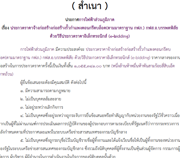 ประกาศการไฟฟ้าส่วนภูมิภาค เรื่อง ประกวดราคาจ้างก่อสร้างก่อสร้างรั้วกำแพงคอนกรีตบล็อค(ตามมาตราฐาน กฟภ.) กฟส.อ.บรรพตพิสัย ด้วยวิธีประกวดราคาอิเล็กทรอนิกส์ (e-bidding)