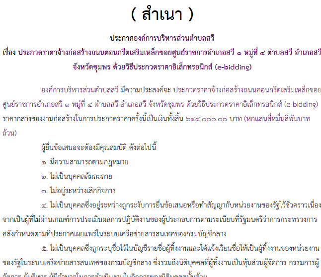 ประกาศองค์การบริหารส่วนตำบลสวี เรื่อง ประกวดราคาจ้างก่อสร้างถนนคอนกรีตเสริมเหล็กซอยศูนย์ราชการอำเภอสวี ๑ หมู่ที่ ๔ ตำบลสวี อำเภอสวี จังหวัดชุมพร ด้วยวิธีประกวดราคาอิเล็กทรอนิกส์ (e-bidding)
