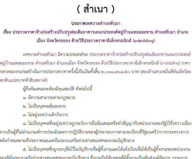 ประกาศเทศบาลตำบลทับมา เรื่อง ประกวดราคาจ้างก่อสร้างปรับปรุุงต่อเติมอาคารเอนกประสงค์หมู่บ้านแหลมมะขาม ตำบลทับมา อำเภอเมือง จังหวัดระยอง ด้วยวิธีประกวดราคาอิเล็กทรอนิกส์ (e-bidding)