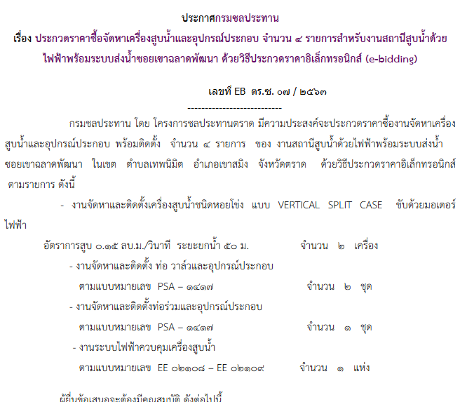 ประกาศจัดซื้อจัดจ้าง กรมชลประทาน โดย โครงการชลประทานตราด มีความประสงค์จะประกวดราคาซื้องานจัดหาเครื่องสูบน้ำและอุปกรณ์ประกอบ พร้อมติดตั้ง จำนวน 4 รายการ ของ งานสถานีสูบน้ำด้วยไฟฟ้าพร้อมระบบส่งน้ำ ซอยเขาฉลาดพัฒนา ในเขต ตำบลเทพนิมิต อำเภอเขาสมิง จังหวัดตราด ด้วยวิธีประกวดราคาอิเล็กทรอนิกส์ (e-bidding)