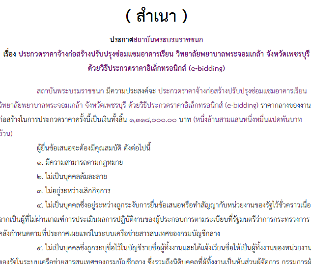 ประกาศสถาบันพระบรมราชชนก เรื่อง ประกวดราคาจ้างก่อสร้างปรับปรุงซ่อมแซมอาคารเรียน วิทยาลัยพยาบาลพระจอมเกล้า จังหวัดเพชรบุรี ด้วยวิธีประกวดราคาอิเล็กทรอนิกส์ (e-bidding)