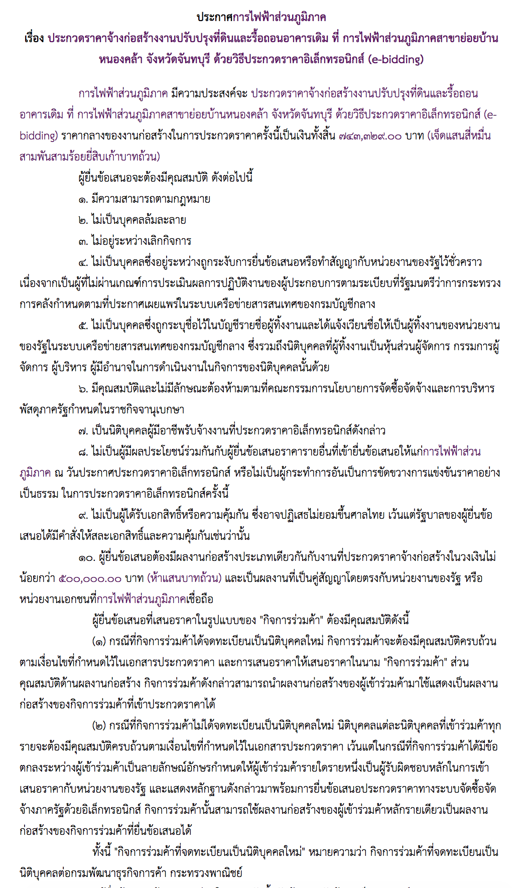 ประกาศการไฟฟ้าส่วนภูมิภาค เรื่อง ประกวดราคาจ้างก่อสร้างงานปรับปรุงที่ดินและรื้อถอนอาคารเดิม ที่ การไฟฟ้าส่วนภูมิภาคสาขาย่อยบ้านหนองคล้า จังหวัดจันทบุรี ด้วยวิธีประกวดราคาอิเล็กทรอนิกส์ (e-bidding)