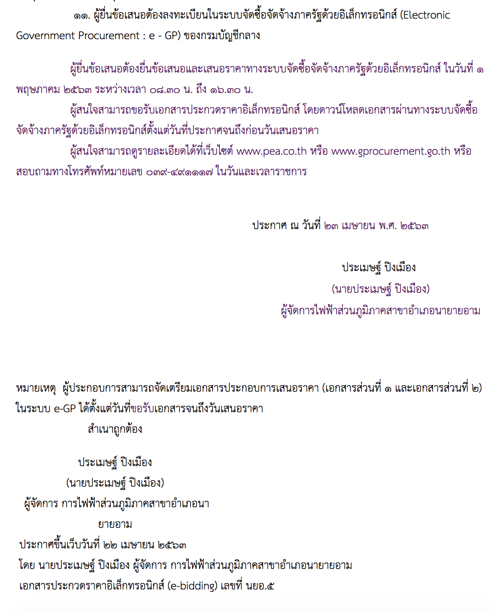 ผู้สนใจสามารถดูรายละเอียดได้ที่เว็บไซต์ www.pea.co.th หรือ www.gprocurement.go.th หรือสอบถามทางโทรศัพท์หมายเลข ๐๓๙-๔๙๑๑๑๗ ในวันและเวลาราชการ