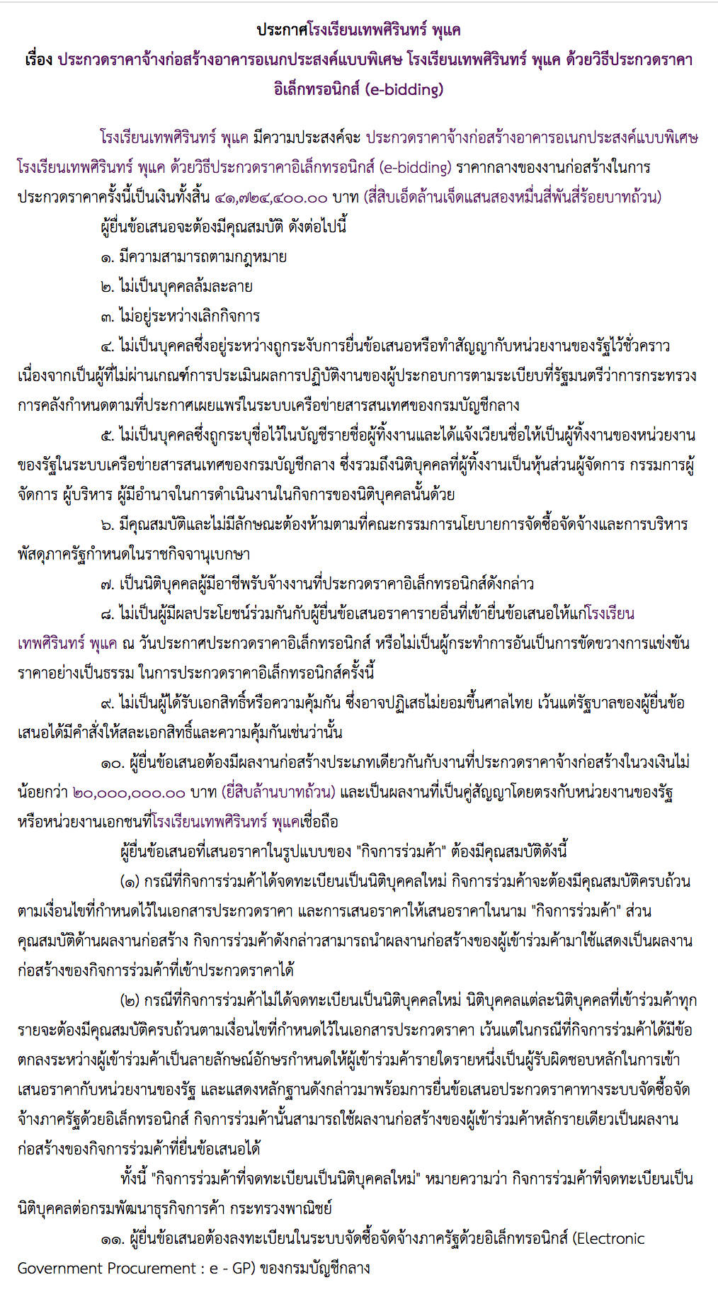 ประกาศโรงเรียนเทพศิรินทร์ พุแค เรื่อง ประกวดราคาจ้างก่อสร้างอาคารอเนกประสงค์แบบพิเศษ โรงเรียนเทพศิรินทร์ พุแค ด้วยวิธีประกวดราคาอิเล็กทรอนิกส์ (e-bidding)