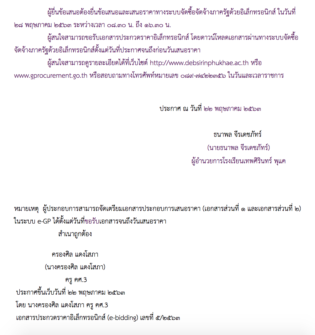 ผู้สนใจสามารถดูรายละเอียดได้ที่เว็บไซต์ http://www.debsirinphukhae.ac.th หรือ www.gprocurement.go.th หรือสอบถามทางโทรศัพท์หมายเลข ๐๘๙-๗๔๒๒๓๕๖ ในวันและเวลาราชการ