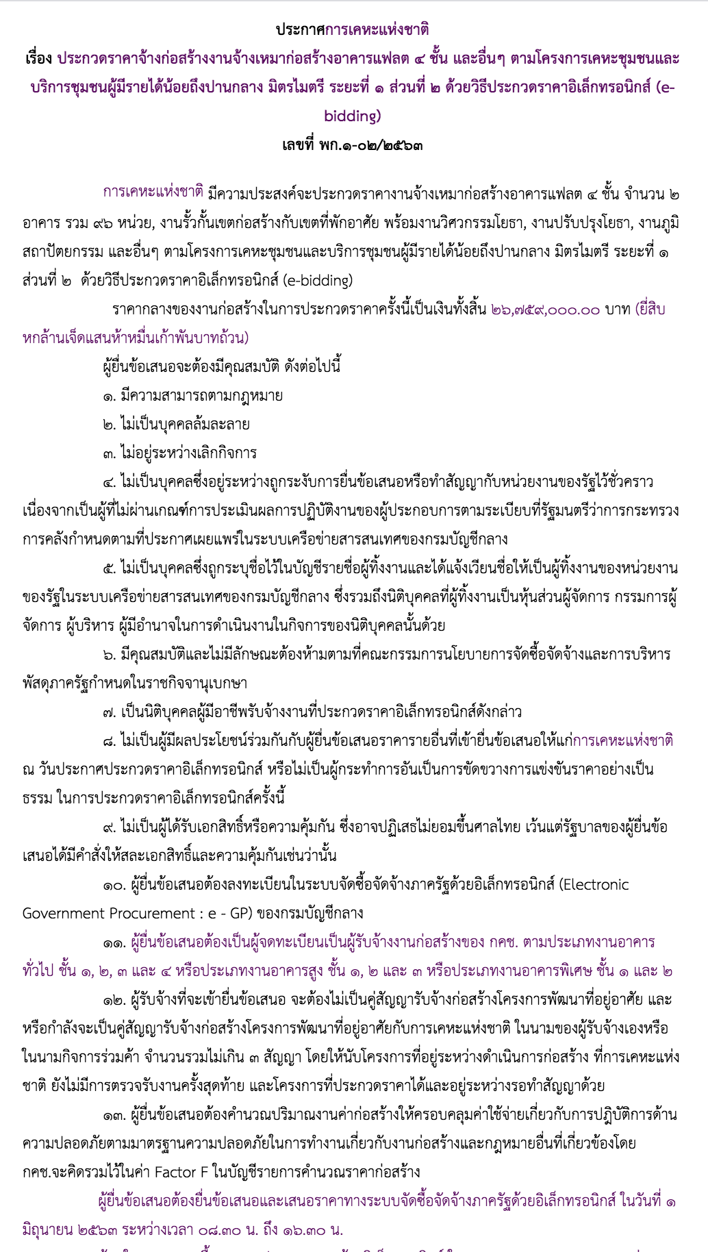 ประกาศการเคหะแห่งชาติ เรื่อง ประกวดราคาจ้างก่อสร้างงานจ้างเหมาก่อสร้างอาคารแฟลต ๔ ชั้น และอื่นๆ ตามโครงการเคหะชุมชนและบริการชุมชนผู้มีรายได้น้อยถึงปานกลาง มิตรไมตรี ระยะที่ ๑ ส่วนที่ ๒ ด้วยวิธีประกวดราคาอิเล็กทรอนิกส์ (e-bidding)