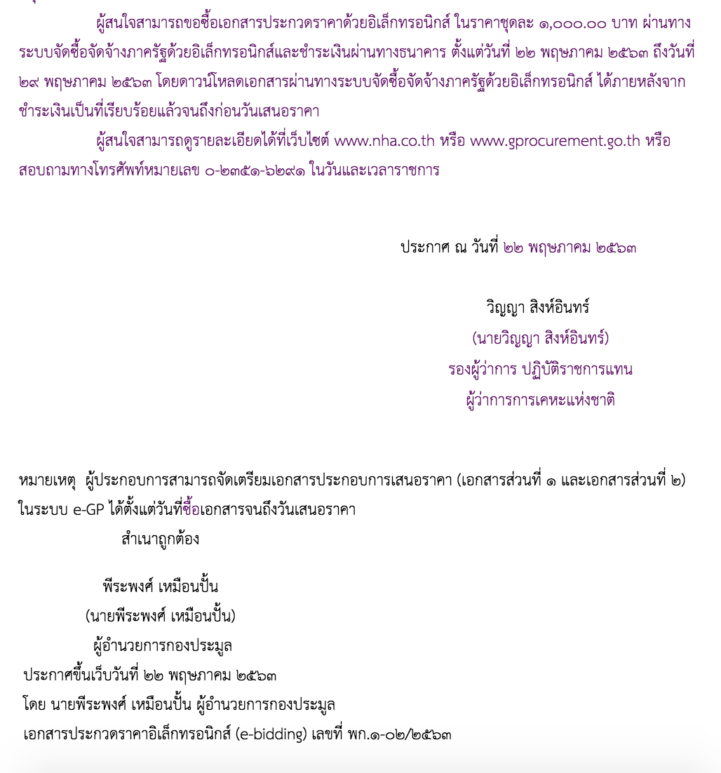 ผู้สนใจสามารถดูรายละเอียดได้ที่เว็บไซต์ www.nha.co.th หรือ www.gprocurement.go.th หรือสอบถามทางโทรศัพท์หมายเลข ๐-๒๓๕๑-๖๒๙๑ ในวันและเวลาราชการ