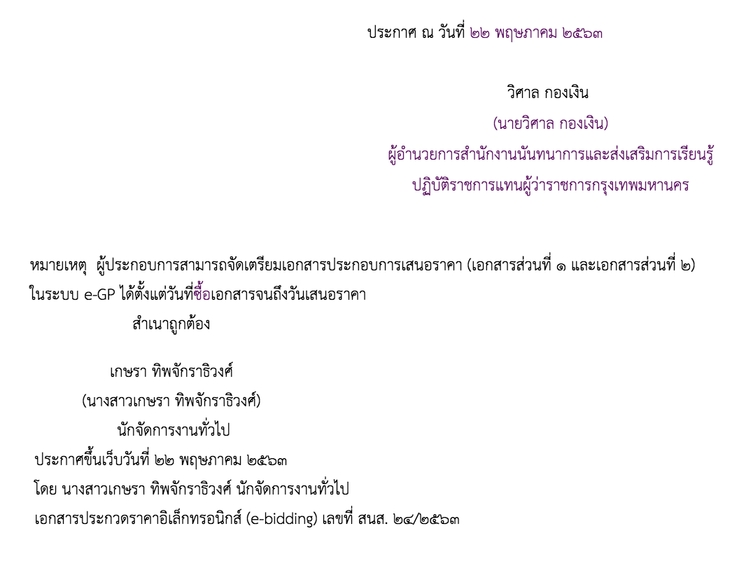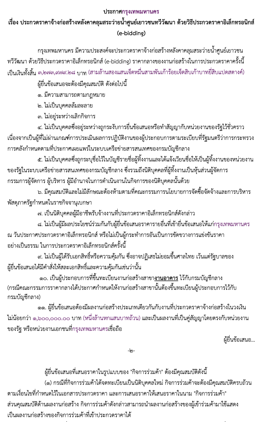 ประกาศกรุงเทพมหานคร เรื่อง ประกวดราคาจ้างก่อสร้างหลังคาคลุมสระว่ายน้ำศูนย์เยาวชนทวีวัฒนา ด้วยวิธีประกวดราคาอิเล็กทรอนิกส์ (e-bidding)
