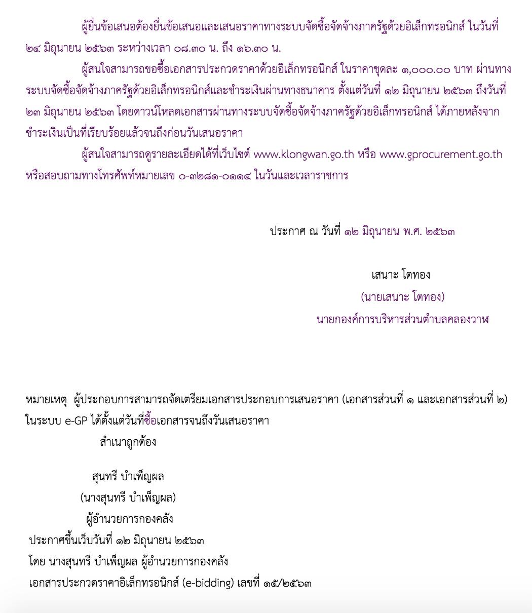 กำหนดยื่นข้อเสนอและเสนอราคา - ยื่นข้อเสนอและเสนอราคาทางระบบจัดซื้อจัดจ้างภาครัฐด้วยอิเล็กทรอนิกส์ ในวันที่ 23 มิถุนายน 2563 ระหว่างเวลา 8.30 น. ถึง 16.30 น
