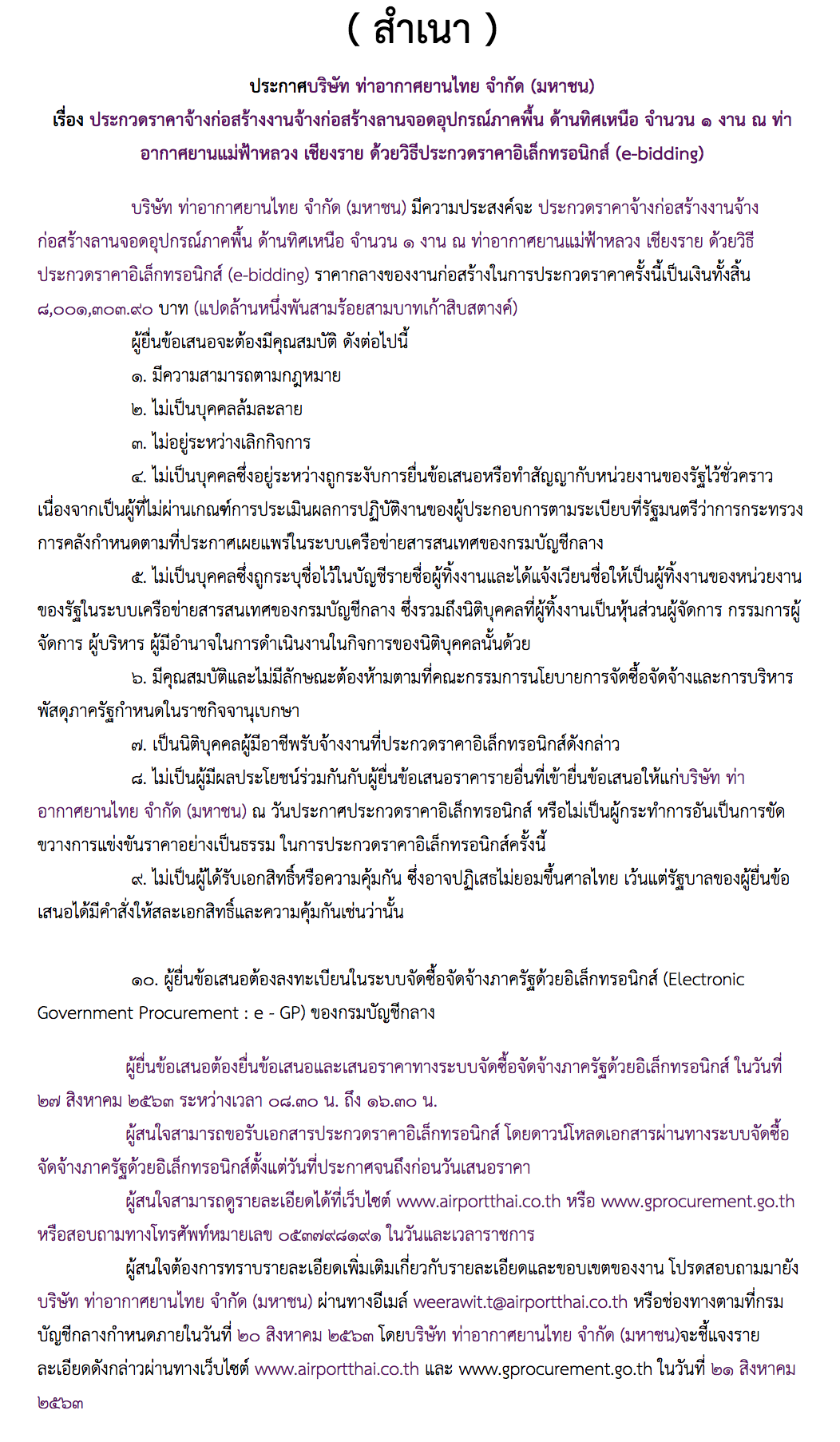 ผู้สนใจสามารถดูรายละเอียดได้ที่เว็บไซต์ www.airportthai.co.th หรือ www.gprocurement.go.th หรือสอบถามทางโทรศัพท์หมายเลข ๐๕๓๗๙๘๑๙๑ ในวันและเวลาราชการ