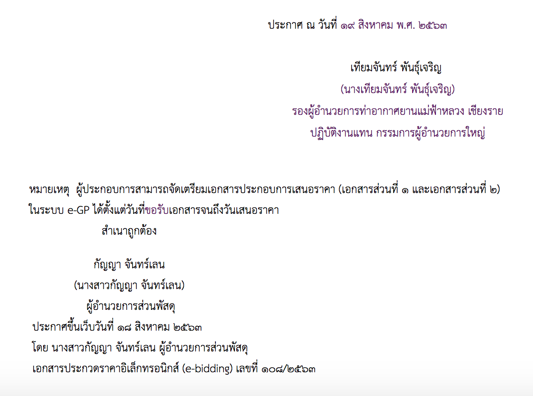 ประกาศบริษัท ท่าอากาศยานไทย จำกัด (มหาชน) เรื่อง ประกวดราคาจ้างก่อสร้างงานจ้างก่อสร้างลานจอดอุปกรณ์ภาคพื้น ด้านทิศเหนือ จำนวน ๑ งาน ณ ท่าอากาศยานแม่ฟ้าหลวง เชียงราย ด้วยวิธีประกวดราคาอิเล็กทรอนิกส์ (e-bidding)