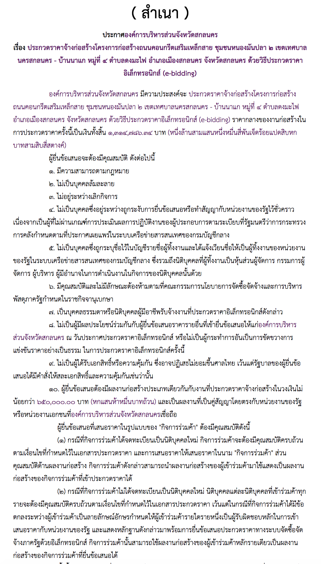 ประกาศองค์การบริหารส่วนจังหวัดสกลนคร เรื่อง ประกวดราคาจ้างก่อสร้างโครงการก่อสร้างถนนคอนกรีตเสริมเหล็กสาย ชุมชนหนองมันปลา ๒ เขตเทศบาลนครสกลนคร - บ้านนาแก หมู่ที่ ๔ ตำบลดงมะไฟ อำเภอเมืองสกลนคร จังหวัดสกลนคร ด้วยวิธีประกวดราคาอิเล็กทรอนิกส์ (e-bidding)