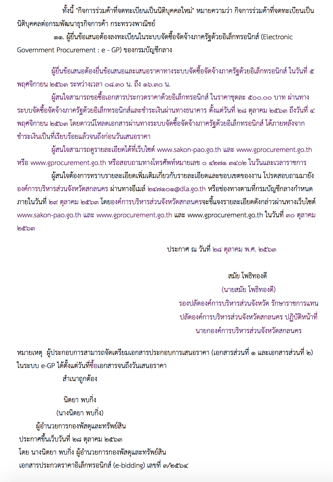 ผู้สนใจสามารถดูรายละเอียดได้ที่เว็บไซต์ www.sakon-pao.go.th และ www.gprocurement.go.th หรือ www.gprocurement.go.th หรือสอบถามทางโทรศัพท์หมายเลข ๐ ๔๒๗๑ ๓๔๐๒ ในวันและเวลาราชการ