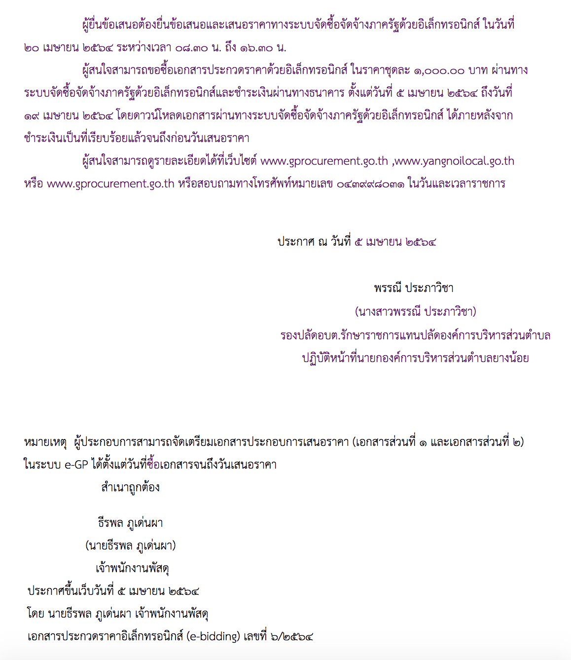 ผู้สนใจสามารถดูรายละเอียดได้ที่เว็บไซต์ www.gprocurement.go.th ,www.yangnoilocal.go.th หรือ www.gprocurement.go.th หรือสอบถามทางโทรศัพท์หมายเลข ๐๔๓๙๙๘๐๓๑ ในวันและเวลาราชการ