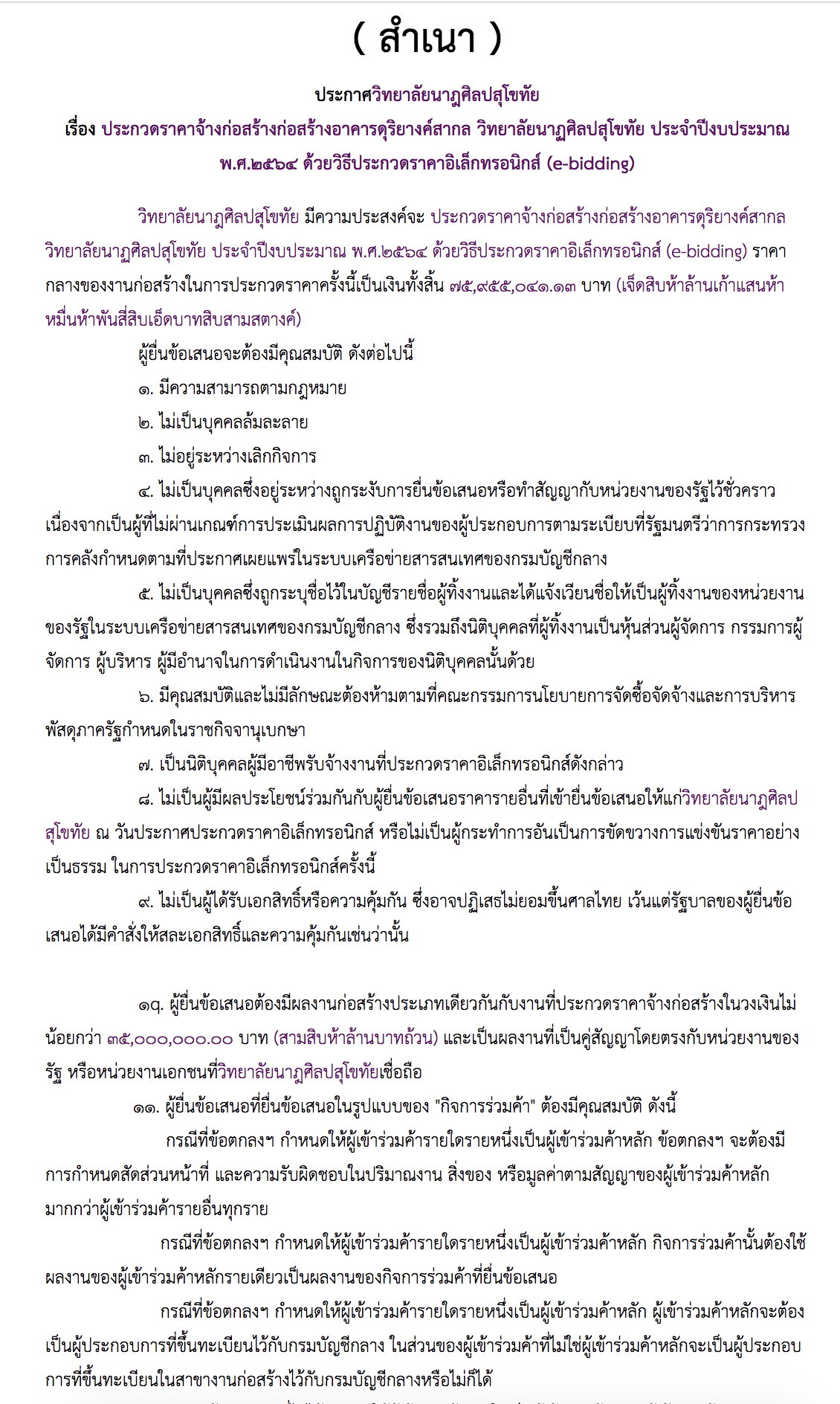 ประกาศวิทยาลัยนาฎศิลปสุโขทัย เรื่อง ประกวดราคาจ้างก่อสร้างก่อสร้างอาคารดุริยางค์สากล วิทยาลัยนาฏศิลปสุโขทัย ประจำปีงบประมาณ พ.ศ.๒๕๖๔ ด้วยวิธีประกวดราคาอิเล็กทรอนิกส์ (e-bidding)
