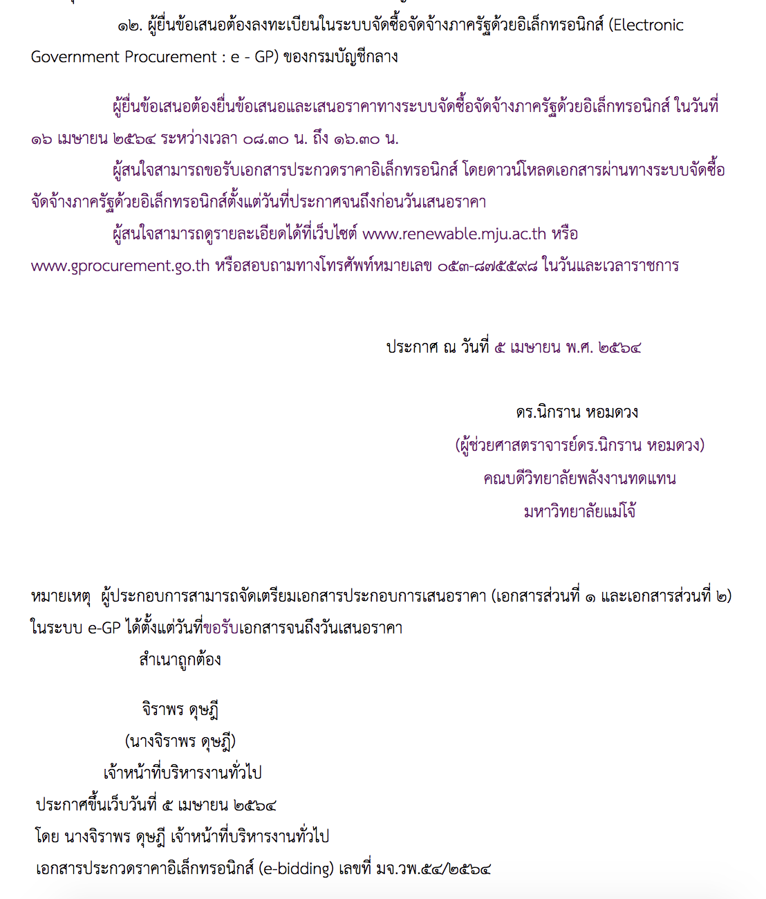 ผู้สนใจสามารถดูรายละเอียดได้ที่เว็บไซต์ www.renewable.mju.ac.th หรือ www.gprocurement.go.th หรือสอบถามทางโทรศัพท์หมายเลข ๐๕๓-๘๗๕๕๙๘ ในวันและเวลาราชการ