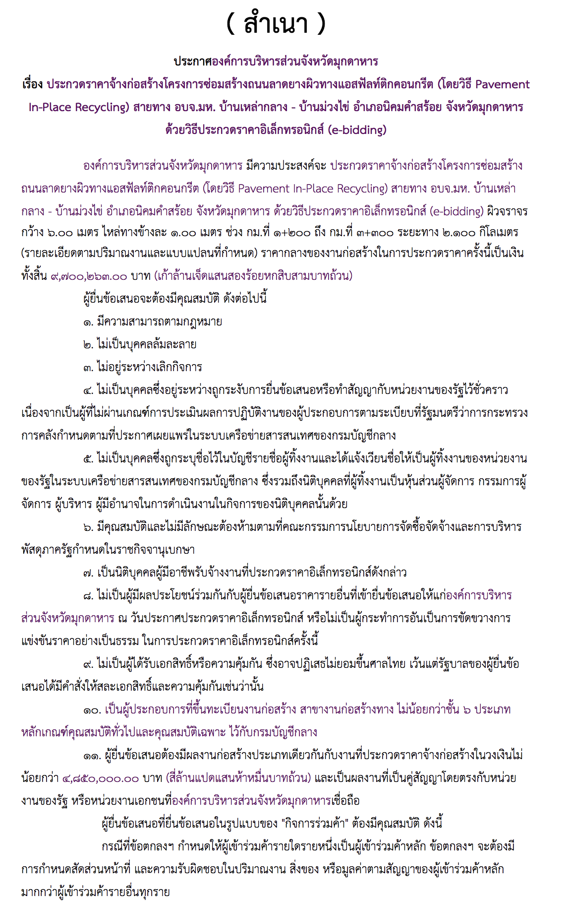 ประกาศองค์การบริหารส่วนจังหวัดมุกดาหาร เรื่อง ประกวดราคาจ้างก่อสร้างโครงการซ่อมสร้างถนนลาดยางผิวทางแอสฟัลท์ติกคอนกรีต (โดยวิธี Pavement In-Place Recycling) สายทาง อบจ.มห. บ้านเหล่ากลาง - บ้านม่วงไข่ อำเภอนิคมคำสร้อย จังหวัดมุกดาหาร ด้วยวิธีประกวดราคาอิเล็กทรอนิกส์ (e-bidding)