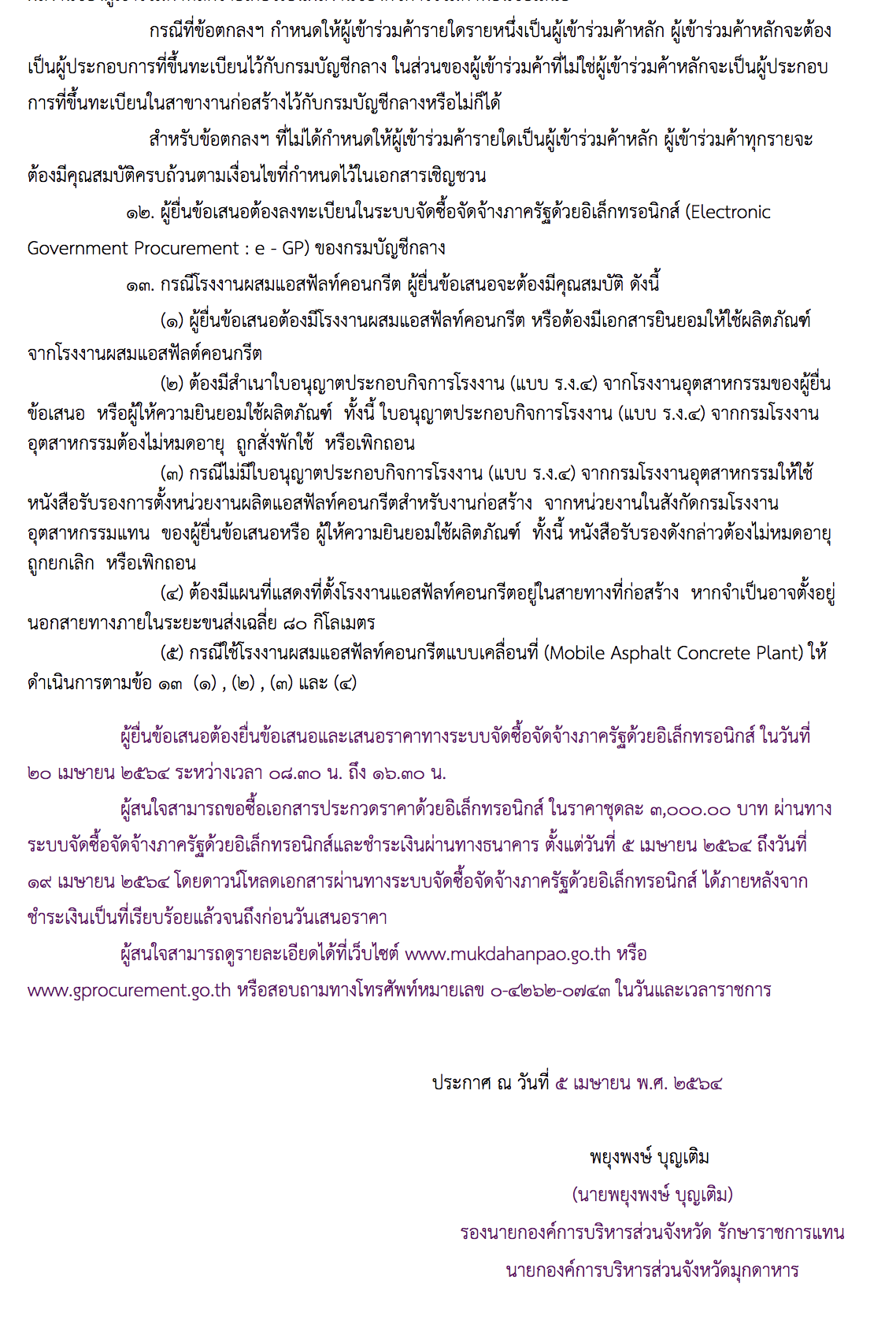 ผู้สนใจสามารถดูรายละเอียดได้ที่เว็บไซต์ www.mukdahanpao.go.th หรือ www.gprocurement.go.th หรือสอบถามทางโทรศัพท์หมายเลข ๐-๔๒๖๒-๐๗๔๓ ในวันและเวลาราชการ