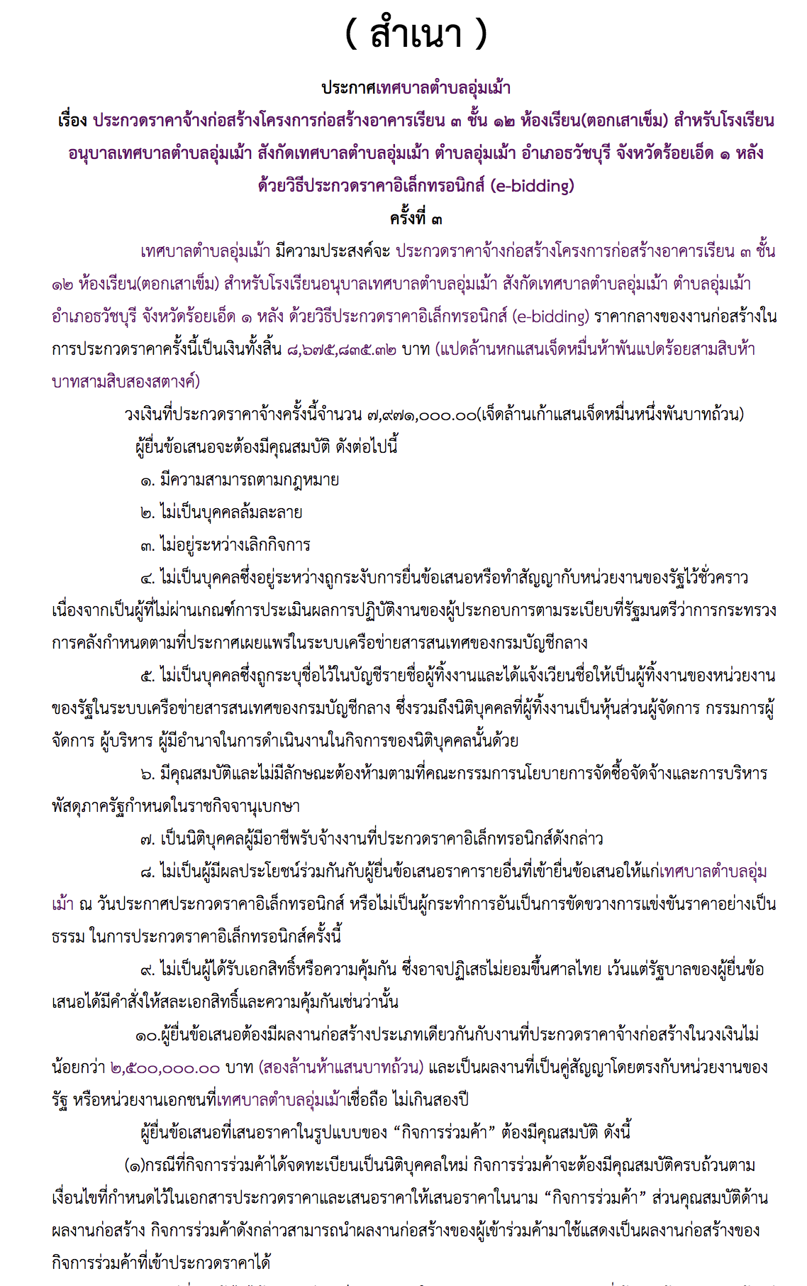 ประกาศเทศบาลตำบลอุ่มเม้า เรื่อง ประกวดราคาจ้างก่อสร้างโครงการก่อสร้างอาคารเรียน ๓ ชั้น ๑๒ ห้องเรียน(ตอกเสาเข็ม) สำหรับโรงเรียนอนุบาลเทศบาลตำบลอุ่มเม้า สังกัดเทศบาลตำบลอุ่มเม้า ตำบลอุ่มเม้า อำเภอธวัชบุรี จังหวัดร้อยเอ็ด ๑ หลัง ด้วยวิธีประกวดราคาอิเล็กทรอนิกส์ (e-bidding)