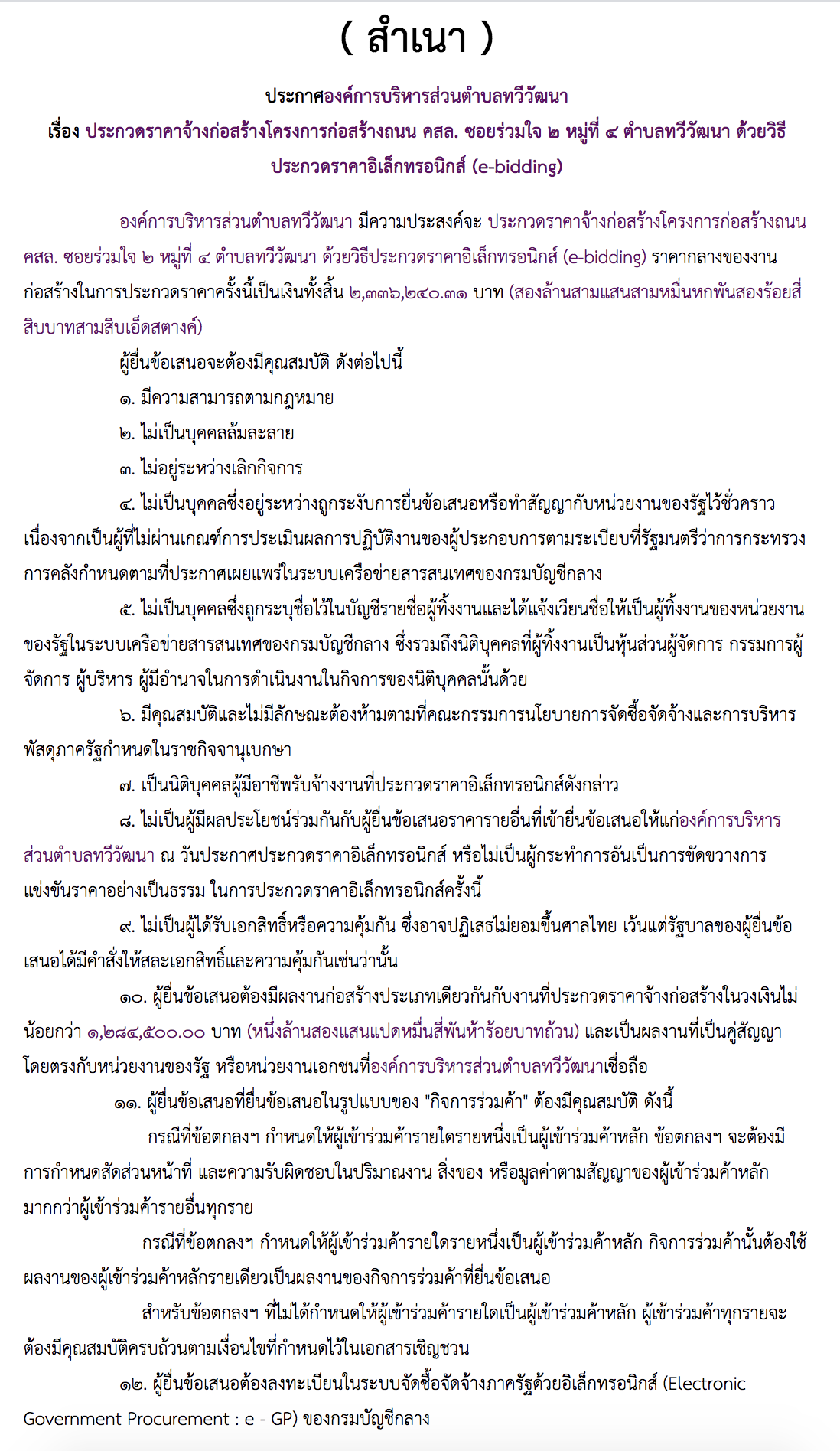 ประกาศองค์การบริหารส่วนตำบลทวีวัฒนา เรื่อง ประกวดราคาจ้างก่อสร้างโครงการก่อสร้างถนน คสล. ซอยร่วมใจ ๒ หมู่ที่ ๔ ตำบลทวีวัฒนา ด้วยวิธีประกวดราคาอิเล็กทรอนิกส์ (e-bidding)