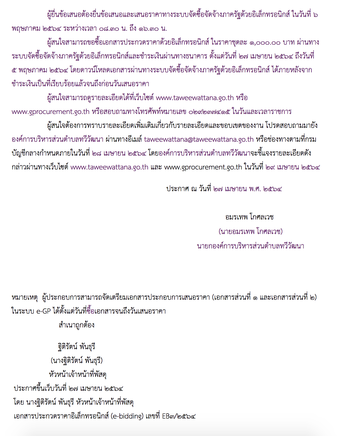 ผู้สนใจสามารถดูรายละเอียดได้ที่เว็บไซต์ www.taweewattana.go.th หรือ www.gprocurement.go.th หรือสอบถามทางโทรศัพท์หมายเลข ๐๒๙๒๓๗๔๑๕ ในวันและเวลาราชการ