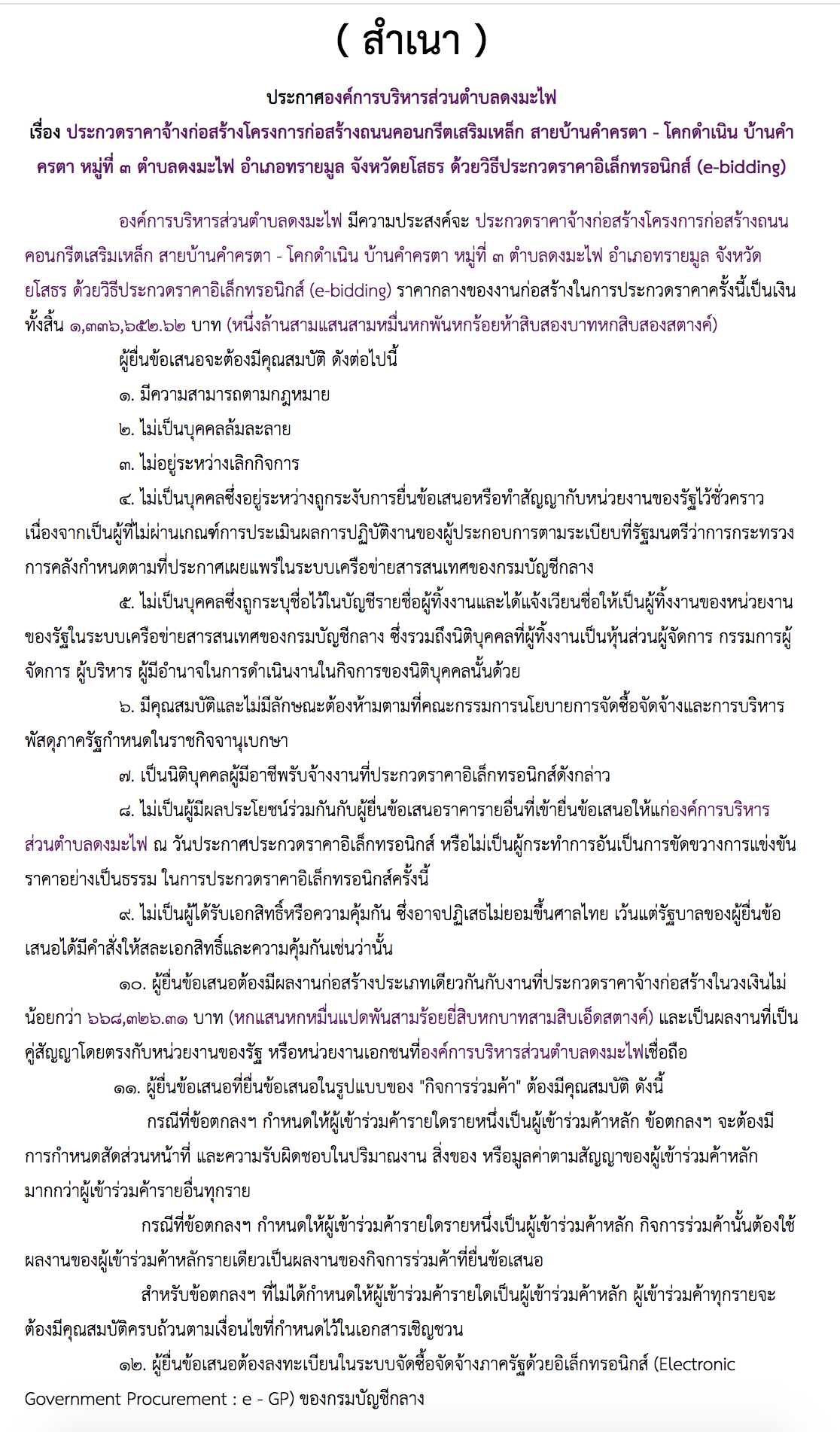 ประกาศองค์การบริหารส่วนตำบลดงมะไฟ เรื่อง ประกวดราคาจ้างก่อสร้างโครงการก่อสร้างถนนคอนกรีตเสริมเหล็ก สายบ้านคำครตา - โคกดำเนิน บ้านคำครตา หมู่ที่ ๓ ตำบลดงมะไฟ อำเภอทรายมูล จังหวัดยโสธร ด้วยวิธีประกวดราคาอิเล็กทรอนิกส์ (e-bidding)