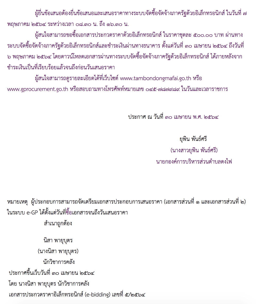 ผู้สนใจสามารถดูรายละเอียดได้ที่เว็บไซต์ www.tambondongmafai.go.th หรือ www.gprocurement.go.th หรือสอบถามทางโทรศัพท์หมายเลข ๐๔๕-๗๘๗๙๘๙ ในวันและเวลาราชการ