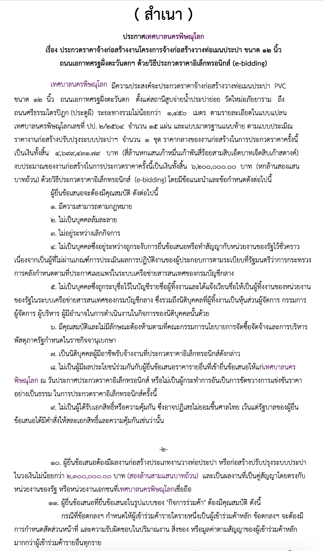ประกาศเทศบาลนครพิษณุโลก เรื่อง ประกวดราคาจ้างก่อสร้างงานโครงการจ้างก่อสร้างวางท่อเมนประปา ขนาด ๑๒ นิ้ว ถนนเอกาทศรฐฝั่งตะวันตกฯ ด้วยวิธีประกวดราคาอิเล็กทรอนิกส์ (e-bidding)