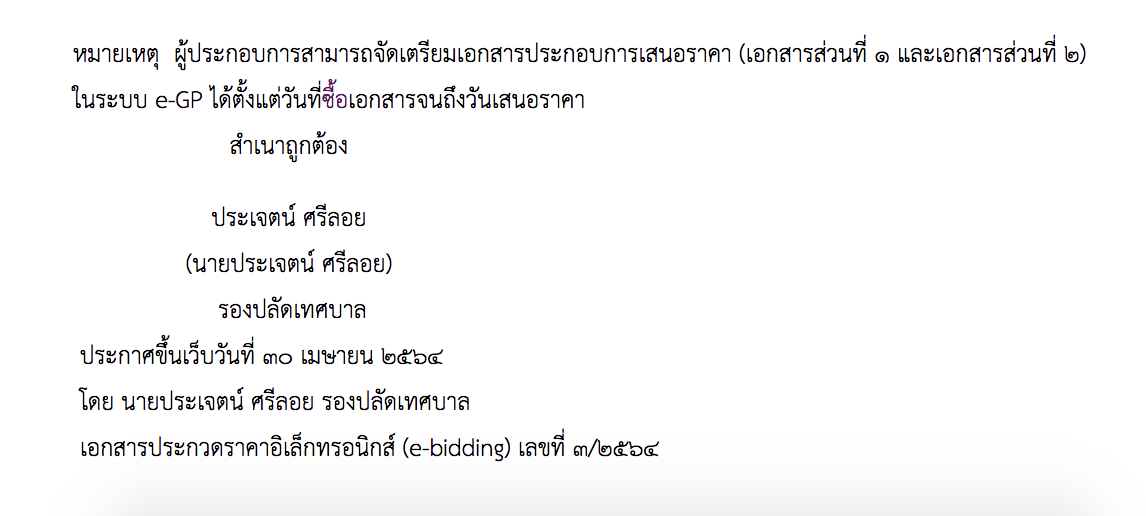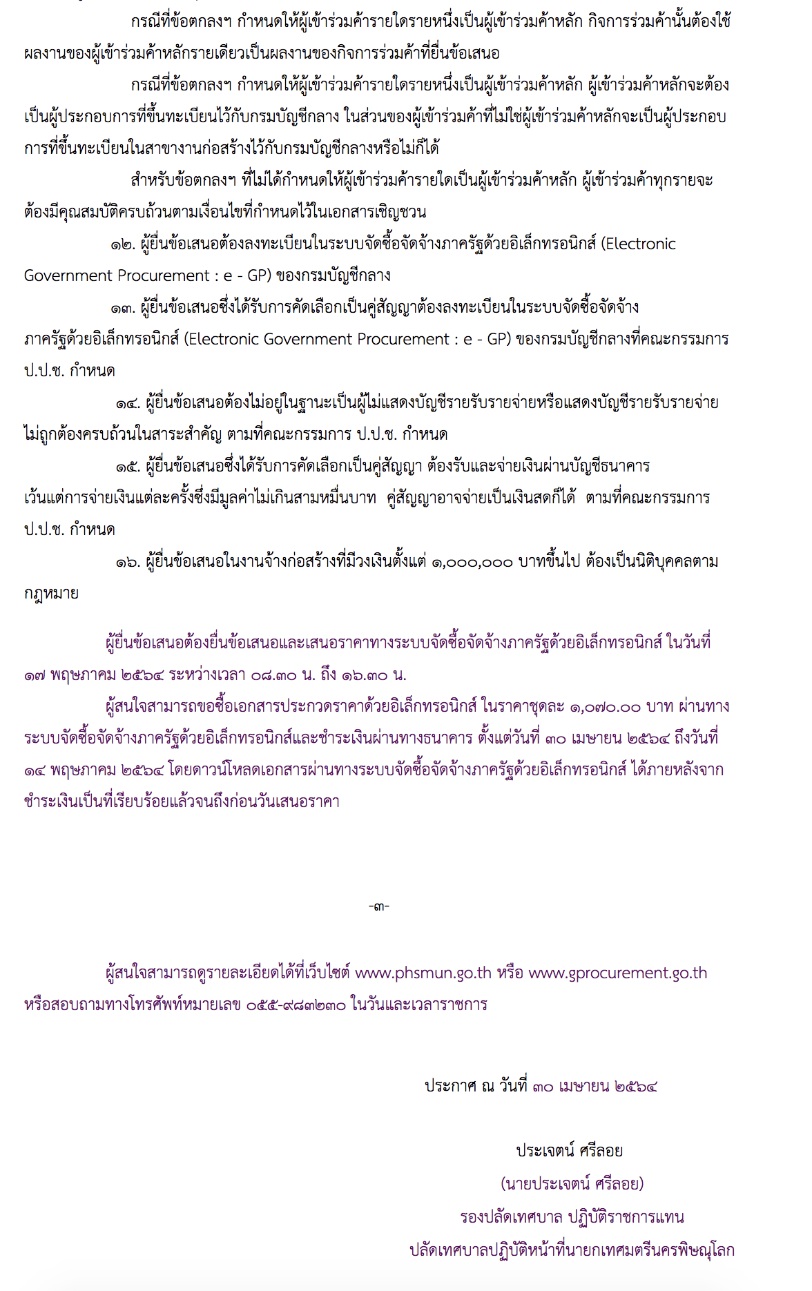 กำหนดยื่นข้อเสนอและเสนอราคา - ยื่นข้อเสนอและเสนอราคาทางระบบจัดซื้อจัดจ้างภาครัฐด้วยอิเล็กทรอนิกส์ ในวันที่ 17 พฤษภาคม 2564 ระหว่างเวลา 8.30 น. ถึง 16.30 น.