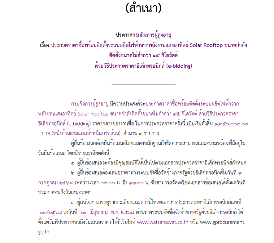 เรื่อง ประกวดราคาซื้อพร้อมติดตั้งระบบผลิตไฟฟ้าจากพลังงานแสงอาทิตย์ Solar Rooftop ขนาดกำลัง ติดตั้งขนาดไม่ต่ำกว่า ๔๕ กิโลวัตต์ ด้วยวิธีประกวดราคาอิเล็กทรอนิกส์ (e-bidding)