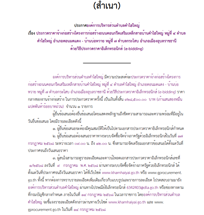 เรื่อง ประกวดราคาจ้างก่อสร้างโครงการก่อสร้างถนนคอนกรีตเสริมเหล็กสายบ้านคำไฮใหญ่ หมู่ที่ ๔ ตำบล คำไฮใหญ่ อำเภอดอนมดแดง - บ้านบ่อหวาย หมู่ที่ ๗ ตำบลกระโสบ อำเภอเมืองอุบลราชธานี ด้วยวิธีประกวดราคาอิเล็กทรอนิกส์ (e-bidding)
