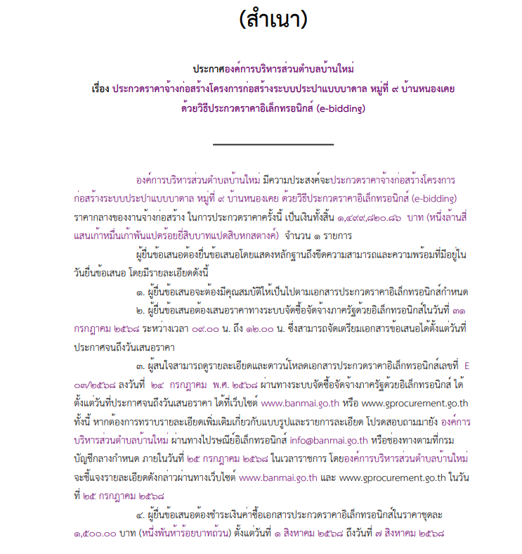 เรื่อง ประกวดราคาจ้างก่อสร้างโครงการก่อสร้างระบบประปาแบบบาดาล หมู่ที่ ๙ บ้านหนองเคย ด้วยวิธีประกวดราคาอิเล็กทรอนิกส์ (e-bidding)