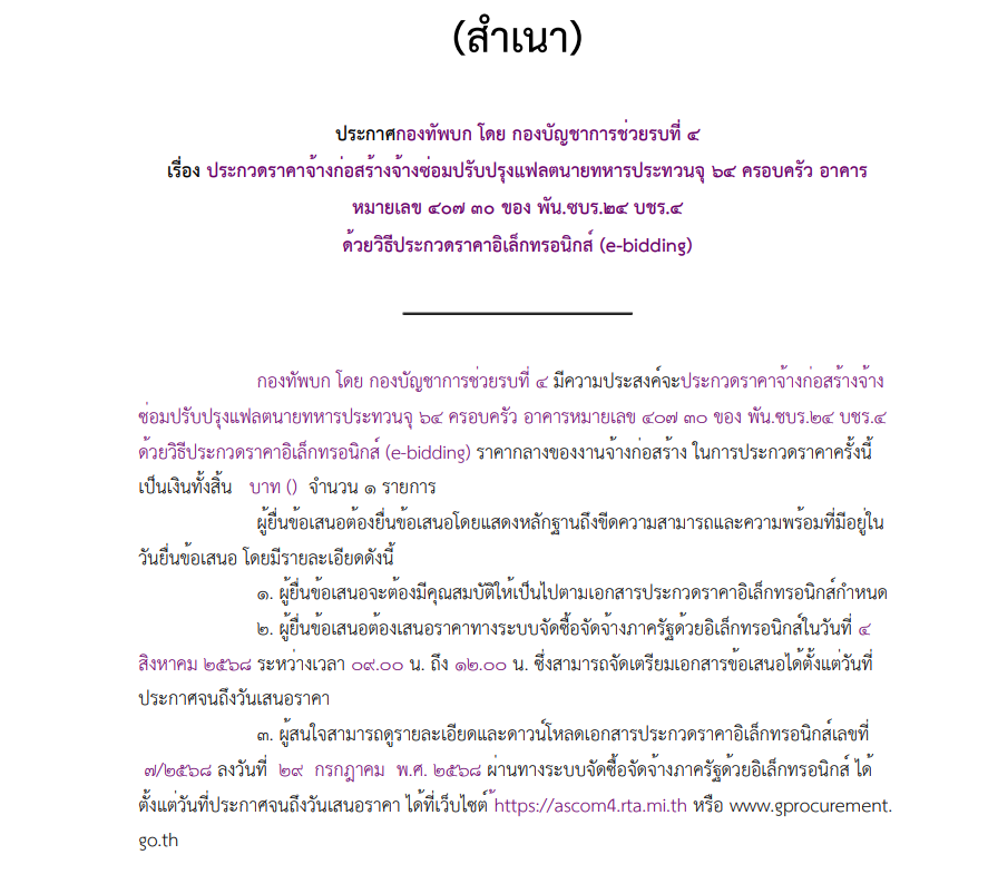 เรื่อง ประกวดราคาจ้างก่อสร้างจ้างซ่อมปรับปรุงแฟลตนายทหารประทวนจุ ๖๔ ครอบครัว อาคาร หมายเลข ๔๐๗ ๓๐ ของ พัน.ซบร.๒๔ บชร.๔ ด้วยวิธีประกวดราคาอิเล็กทรอนิกส์ (e-bidding)
