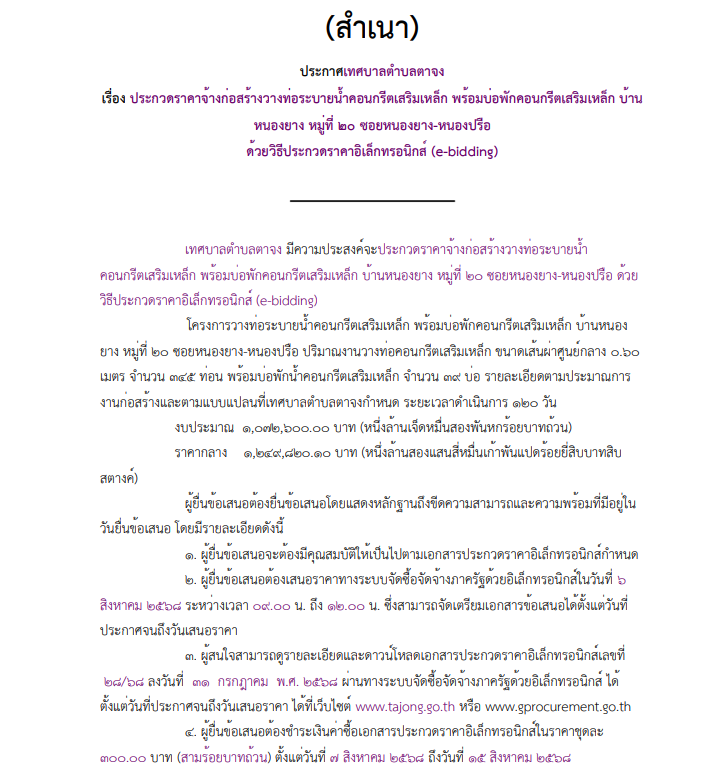 เรื่อง ประกวดราคาจ้างก่อสร้างวางท่อระบายน้ำคอนกรีตเสริมเหล็ก พร้อมบ่อพักคอนกรีตเสริมเหล็ก บ้าน หนองยาง หมู่ที่ ๒๐ ซอยหนองยาง-หนองปรือ ด้วยวิธีประกวดราคาอิเล็กทรอนิกส์ (e-bidding)