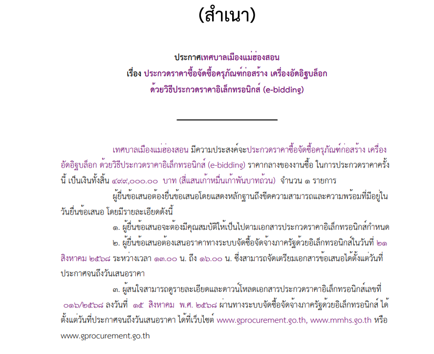 เรื่อง ประกวดราคาซื้อจัดซื้อครุภัณฑ์ก่อสร้าง เครื่องอัดอิฐบล็อก ด้วยวิธีประกวดราคาอิเล็กทรอนิกส์ (e-bidding)