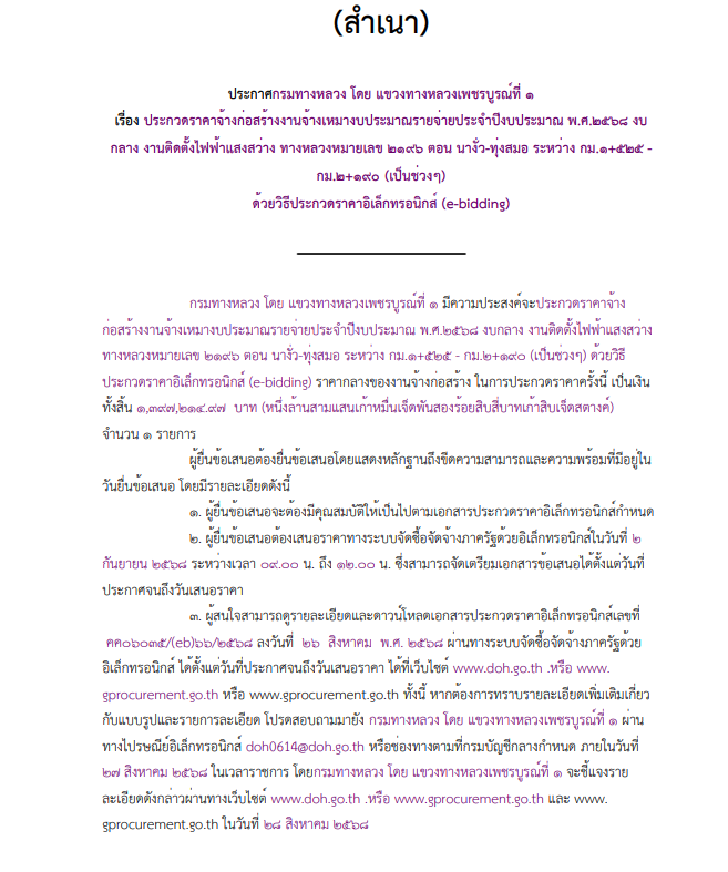 เรื่อง ประกวดราคาจ้างก่อสร้างงานจ้างเหมางบประมาณรายจ่ายประจำปีงบประมาณ พ.ศ.๒๕๖๘ งบ กลาง งานติดตั้งไฟฟ้าแสงสว่าง ทางหลวงหมายเลข ๒๑๙๖ ตอน นางั่ว-ทุ่งสมอ ระหว่าง กม.๑+๕๒๕ - กม.๒+๑๙๐ (เป็นช่วงๆ) ด้วยวิธีประกวดราคาอิเล็กทรอนิกส์ (e-bidding)