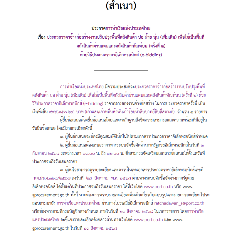 เรื่อง ประกวดราคาจ้างก่อสร้างงานปรับปรุงพื้นที่คลังสินค้า ปอ ฝ้าย นุ่น (เพิ่มเติม) เพื่อใช้เป็นพื้นที่ คลังสินค้าผ่านแดนและคลังสินค้าทัณฑ์บน (ครั้งที่ ๒) ด้วยวิธีประกวดราคาอิเล็กทรอนิกส์ (e-bidding)