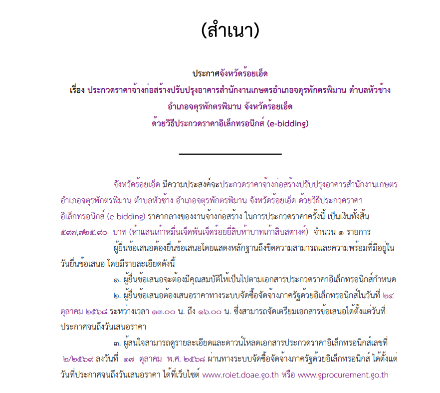 เรื่อง ประกวดราคาจ้างก่อสร้างปรับปรุงอาคารสำนักงานเกษตรอำเภอจตุรพักตรพิมาน ตำบลหัวช้าง อำเภอจตุรพักตรพิมาน จังหวัดร้อยเอ็ด ด้วยวิธีประกวดราคาอิเล็กทรอนิกส์ (e-bidding)
