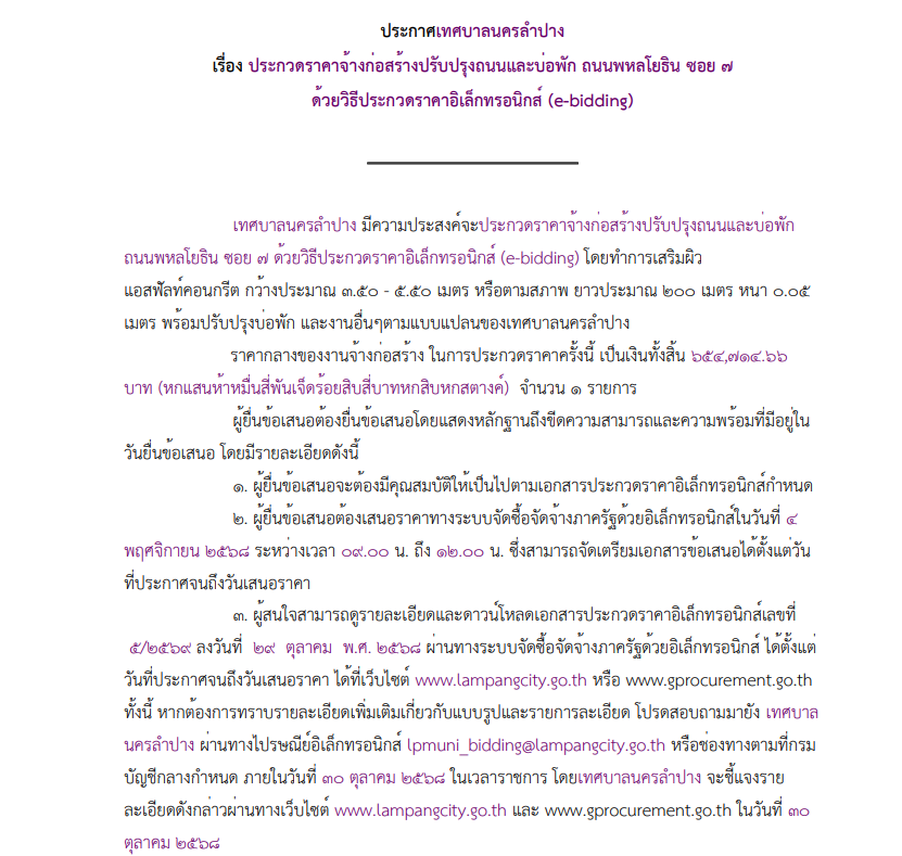 เรื่อง ประกวดราคาจ้างก่อสร้างปรับปรุงถนนและบ่อพัก ถนนพหลโยธิน ซอย ๗ ด้วยวิธีประกวดราคาอิเล็กทรอนิกส์ (e-bidding)