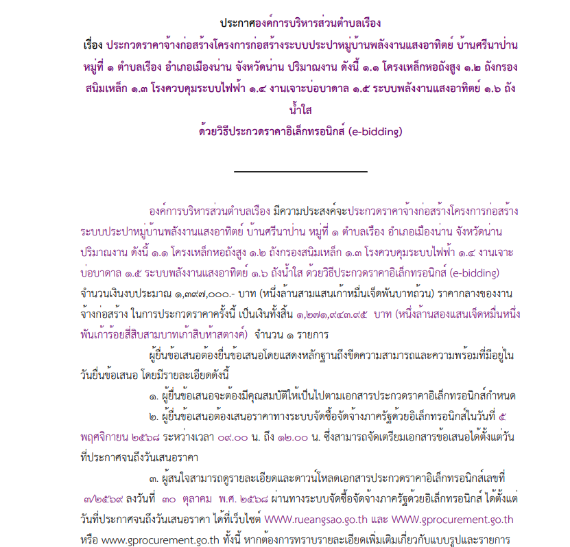 ประกวดราคาจ้างก่อสร้างโครงการก่อสร้างระบบประปาหมู่บ้านพลังงานแสงอาทิตย์ บ้านศรีนาป่าน หมู่ที่ ๑ ตำบลเรือง อำเภอเมืองน่าน จังหวัดน่าน ปริมาณงาน ดังนี้ ๑.๑ โครงเหล็กหอถังสูง ๑.๒ ถังกรอง สนิมเหล็ก ๑.๓ โรงควบคุมระบบไฟฟ้า ๑.๔ งานเจาะบ่อบาดาล ๑.๕ ระบบพลังงานแสงอาทิตย์ ๑.๖ ถัง น้ำใส ด้วยวิธีประกวดราคาอิเล็กทรอนิกส์ (e-bidding)