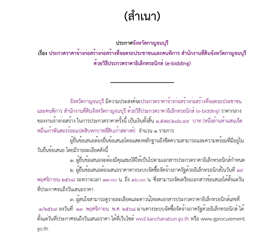 เรื่อง ประกวดราคาจ้างก่อสร้างก่อสร้างที่จอดรถประชาชนและคนพิการ สำนักงานที่ดินจังหวัดกาญจนบุรี ด้วยวิธีประกวดราคาอิเล็กทรอนิกส์ (e-bidding)