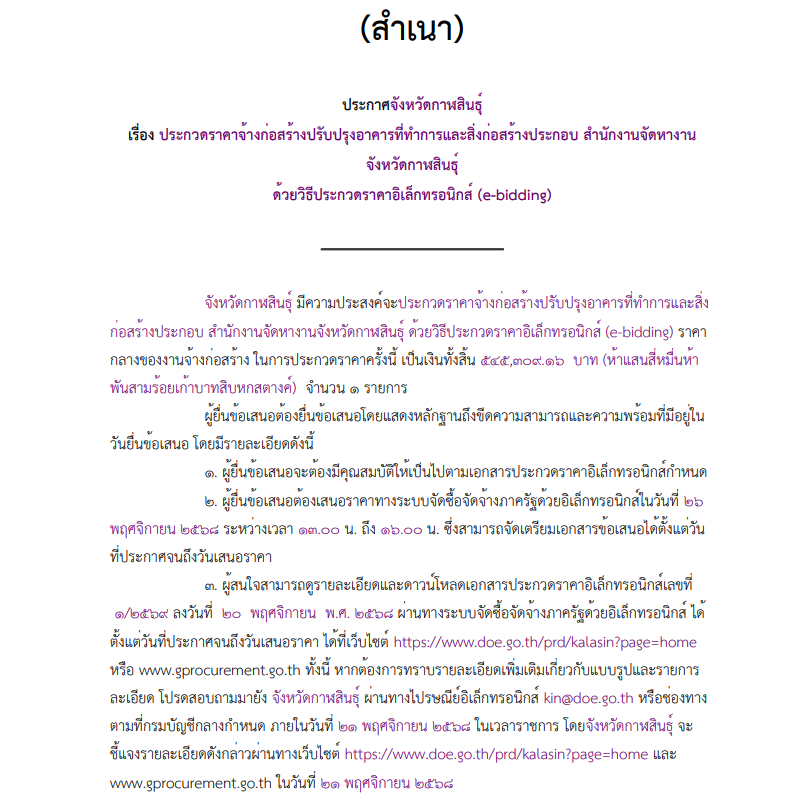 เรื่อง ประกวดราคาจ้างก่อสร้างปรับปรุงอาคารที่ทำการและสิ่งก่อสร้างประกอบ สำนักงานจัดหางาน จังหวัดกาฬสินธุ์ ด้วยวิธีประกวดราคาอิเล็กทรอนิกส์ (e-bidding)