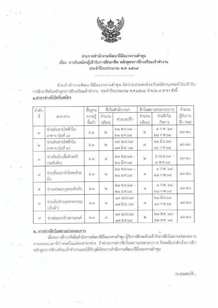 สำนักงานพัฒนาฝีมือแรงงานลำพูน เปิดรับสมัครการฝึกอบรมให้แก่เยาวชน แรงงานใหม่ ผู้จบการศึกษา ผู้ว่างงาน ผู้ถูกเลิกจ้าง และบุคคลทั่วไปที่สนใจฝึกทักษะอาชีพ เข้ารับการฝึกทักษะอาชีพฟรี ในหลักสูตรการฝึกเตรียมเข้าทำงา ประจำปีงบประมาณ พ.ศ.2564 ซึ่งมีสาขาช่างทั้งหมดทั้งสิ้น จำนวน 7 สาขาในหลักสูตร เพื่อฝึกฝนพื้นฐานทักษะการประกอบอาชีพ พัฒนาความรู้ความสามารถ ให้มีความพร้อมในการประกอบอาชีพ สาขาช่างในหลักสูตรที่ได้สำเร็จการฝึกทั้งหมดจะได้รับวุฒิบัตรสามารถนำไปแนบสมัครงานได้