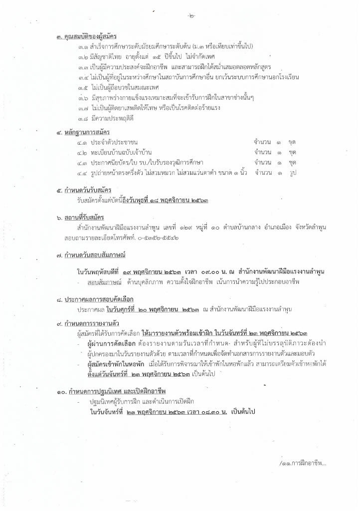 วันสอบสัมภาษณ์ วันที่ 19 พฤศจิกายน 2563 เวลา 09.00 น. ณ สำนักงานพัฒนาฝีมือแรงงานลำพูน