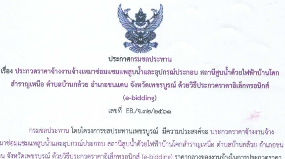 ประกาศกรลประทาน เรื่อง ประกวดราคาจ้างงานจ้างเหมาซ่อมแซมสูบน้ำและอุปกรณ์ประกอบ สถานีสูบน้ำด้วยไฟฟ้าบ้านโคกสำราญเหนือ ตำบลบ้านกล้วย อำเภอชนแดน จังหวัดเพชรบูรณ์ ด้วยวิธีประกวดราคาอิเล็กทรอนิกส์ (e-bidding) เลขที่ EB./จ.32/2561